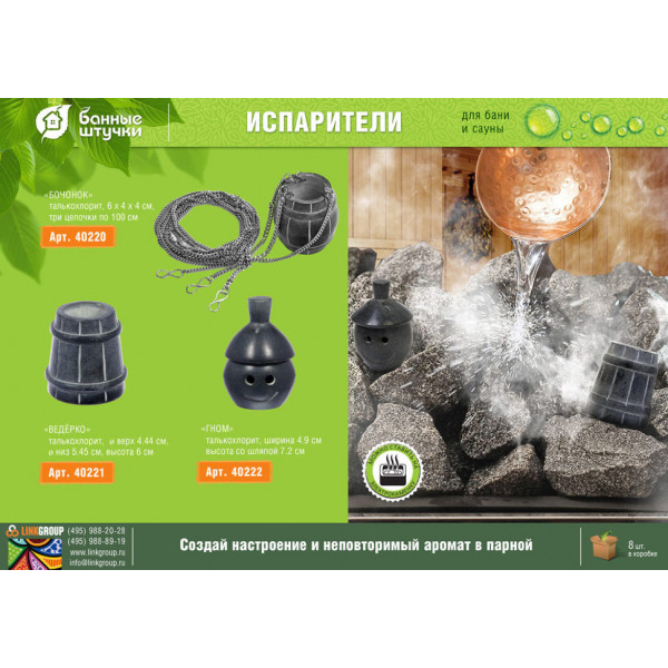 Испаритель ароматов создаст приятную и целебную атмосферу в бане и сауне. Ароматы помогут вам поднять настроение или расслабиться после тяжелого рабочего дня, а в период простудных заболеваний эфирные масла помогут очистить воздух помещения от вредоносных вирусов и болезнетворных микробов. Ароматерапия усиливает оздоровительный эффект массажа, бани или сауны, кроме того благоприятно взаимодействует с косметическими процедурами.