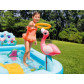 Игровой комплекс украшают надувная арка с обезьянкой, кольцеброс в виде розового фламинго, мордочки крокодила и бегемота. Особенностью и неоспоримым достоинством ДЖУНГЛЕЙ является множество его фонтанчиков, расположенных по всему периметру. Фонтанчики подключаются к садовому шлангу и в жаркий летний день создают комфорт и прохладу играющим малышам. В комплект входит 5 пластиковых разноцветных мячиков - прекрасная забава для малышей. Имеются специальный водосток, предотвращающий перелив маленького бассейна, надувная подушечка в конце горки для комфортного приземления и удобный сливной клапан. Ремкомплект прилагается.