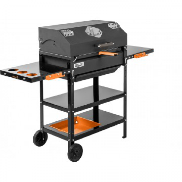Материал: сталь 2 мм (жаровня, зольники, ножки, крышка-гриль), сталь 3мм (угольный лифт), сталь 1,5 мм (полки, столики), дерево (ручки).