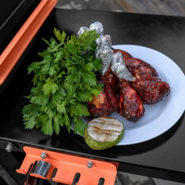 Габаритные размеры мангала с разложенными столиками и открытой крышкой-гриль: 1458 х 484 х1355 мм.