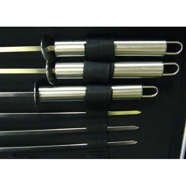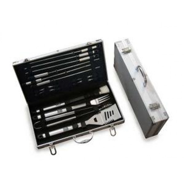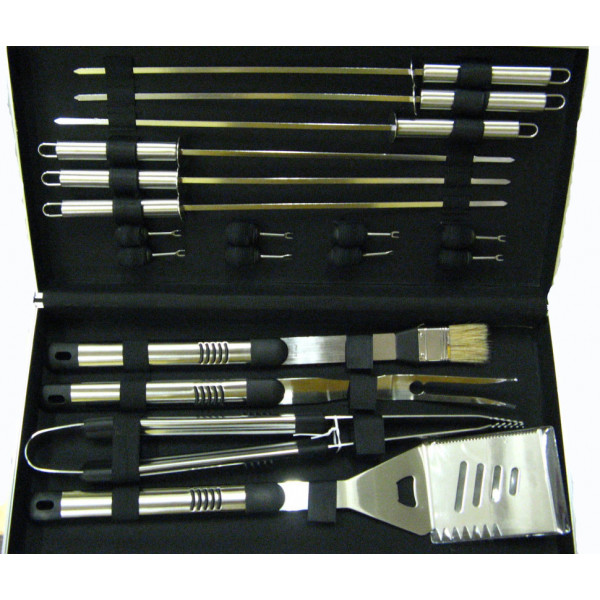 В него входит 18 предметов, что позволяет приготовить фактически любое блюдо при помощи гриля или мангала. Работать с таким набором не только чрезвычайно комфортно и приятно, но еще и достаточно безопасно – ручки каждого приспособления выполнены в эргономичной форме.