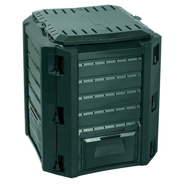 Небольшие отверстия в стенках компостера облегчают поток воздуха, а закрытая форма предотвращает доступ животных к отходам . Откидная крышка на нижней части компостера позволяет легко доставать готовый компост.