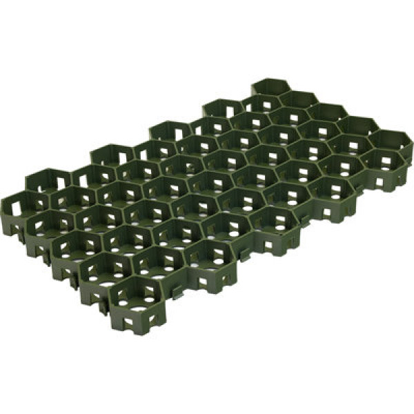 Легко устанавливается и надежно защищает газоны и клумбы от повреждений. Система замков, расположенных по краям решетки, делает её долговечной и устойчивой к нагрузкам. Выдерживает вес автомобиля, что снижает нагрузку на почву и способствует росту травы, камеры решетки удерживают больше влаги. Рабочий диапазон температур от -30с до +90с.
