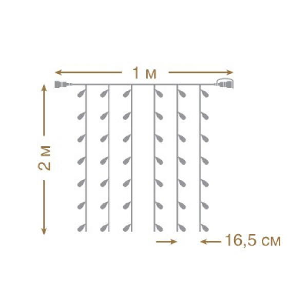 Размер гирлянды 1х2 м, количество светодиодов 96, количество нитей 6. Цвет свечения теплый, режим свечения статичный, цвет провода прозрачный. Степень защиты IP 44. Мощность 1,92 W. Температурный диапазон использования от -30 до +50 °С. Есть возможность последовательного соединения до 1 500 LED. Трансформатор не входит в комплект! Приобретается отдельно. Срок службы 25 000 часов.