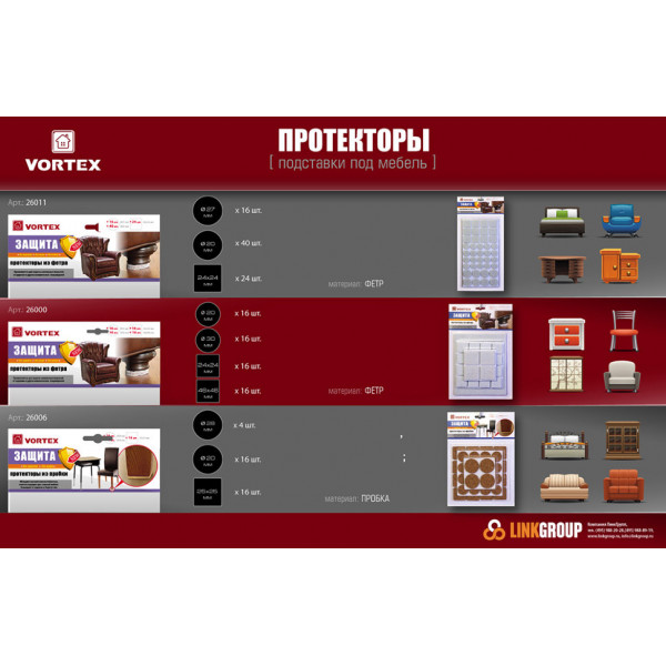 Служат для усиления скольжения предметов мебели по гладким поверхностям, паркету, плитке, ламинату, дереву. В комплект входят круглые протекторы диаметром 20мм-40шт. и 27мм-16шт, квадратные протекторы размером 24*24мм-24шт.