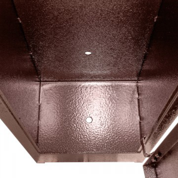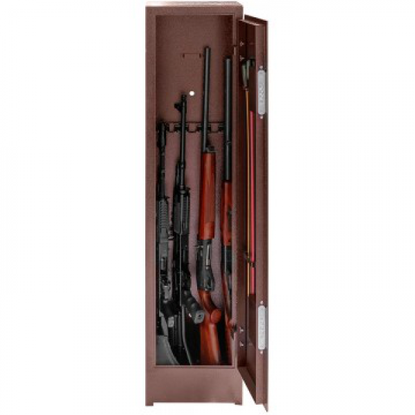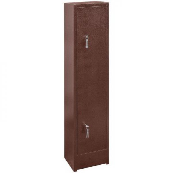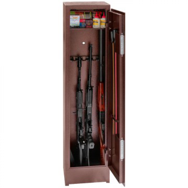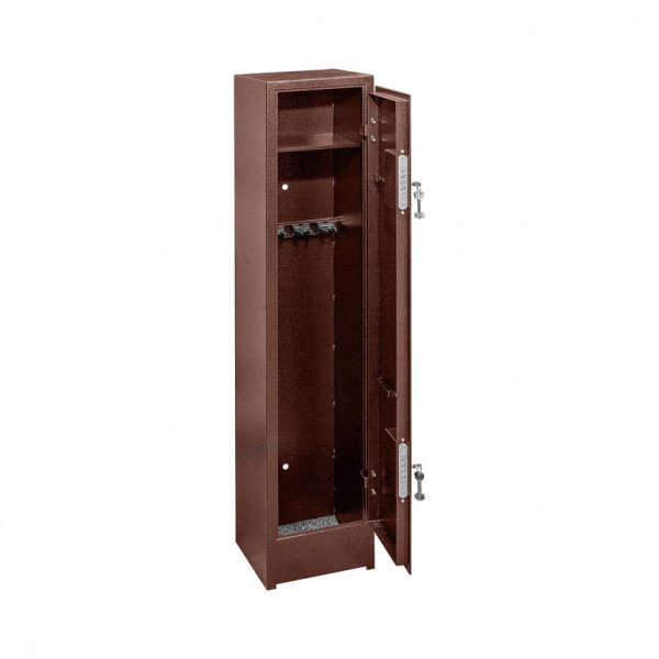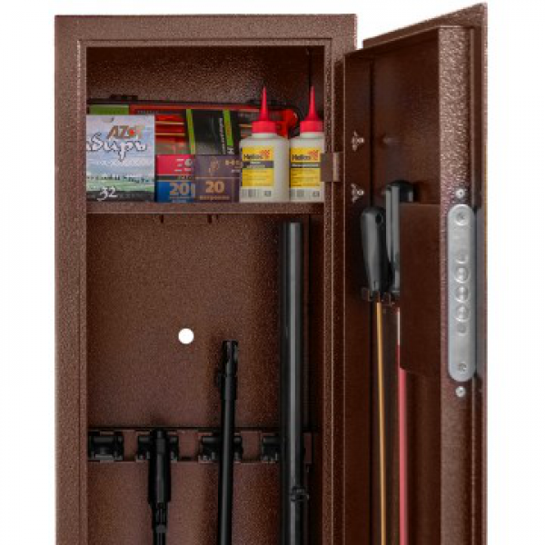 Сварная конструкция корпуса изготовлена из стали 2 мм. Корпус шкафа покрыт полимерной краской (Антик медный) фирмы NEOTEC. Внутри шкаф оснащен 4 стационарными держателями стволов и съемной полкой. Пол шкафа закрыт ковриком, изготовленным из материала «Ковролин». На задней стенке корпуса расположены 2 отверстия (диаметр – 17 мм) для крепления шкафа и 1 отверстие на дне (диаметр - 17мм).