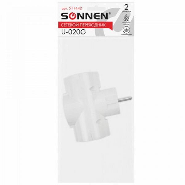 Сетевой переходник в белом корпусе из ABS-пластика. Максимальная нагрузка, которую может выдержать разветвитель, составляет 2200 Вт, а ток – 10 А. Устройство в ударопрочном пластиковом корпусе дополнено заземляющим контактом. Рабочая частота разветвителя SONNEN U-030G составляет 50 Гц.