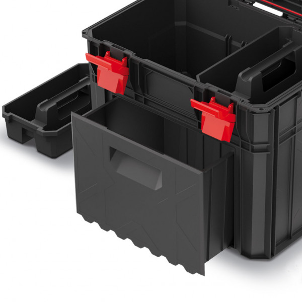 Ящик для инструментов серии X Block LOG представляет собой модульную систему, удобный, и легкий, пригодится как профессионалам, так и обычным пользователям. Наличие внутренних перегородок обеспечивают возможность персонализации внутреннего пространства. Сделан из прочного пластика с усиленной конструкцией, что позволяет хранить и с лёгкостью транспортировать даже самые тяжелые инструменты. Твердая прокладка гарантирует, что продукт является пылезащитным и водостойким.