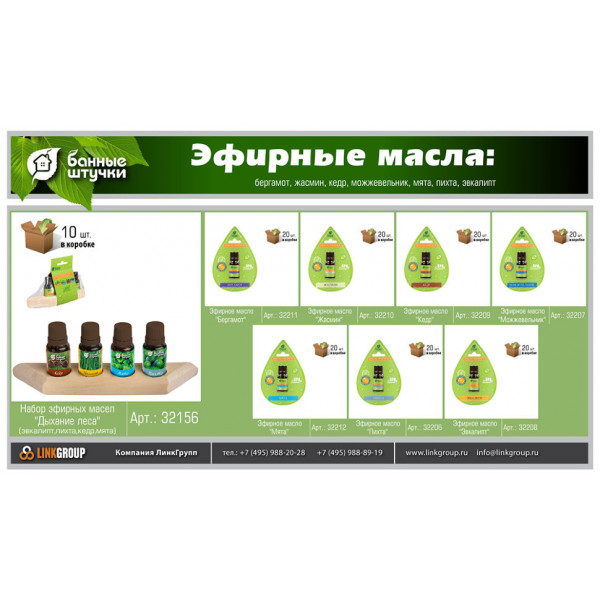 Описание: Сауна, баня, горячая ванна – идеальное место для использования масел. В сочетании с разогретым воздухом в парилке масла усиливают свое воздействие, облегчают дыхание, благотворно влияют на кожу. Эфирное масло «банные штучки» поднимет настроение, создаст атмосферу спокойствия и гармонии.