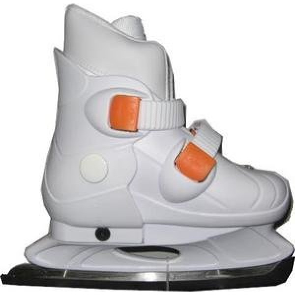 Раздвижные ледовые коньки белого цвета. Ботинок пластиковый литой, с застежками-клипсами