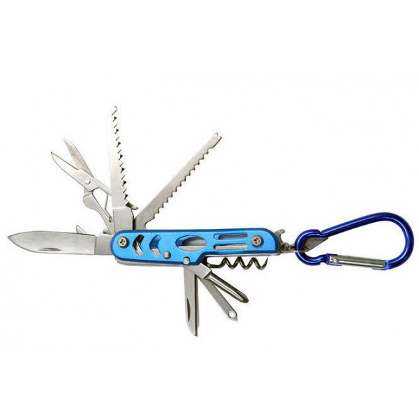 Особенности 12 функций: нож, ножницы, двойная пила, одинарная пила, консервный нож, отвертка, открывашка, шило, напильник, игла, штопор, карабин