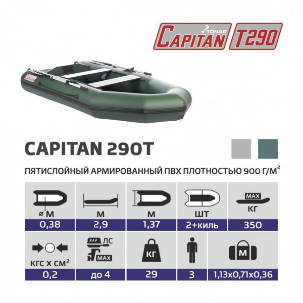 Моторно-гребная лодка «КАПИТАН Т290» производства ГК «ТОНАР» - это легкая и вместительная лодка по привлекательной цене! Просторный кокпит лодки и грузоподъемность до 350 кг позволяют комфортно разместиться 3 пассажирам и расположить весь необходимый груз. За счет оснащения лодки килеватым днищем улучшается ее управляемость, обеспечивается плавное всхождение на волну, что позволяет уверенно глиссировать с мотором до 5 л.с.