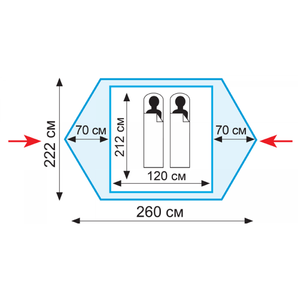 внешняя палатка 260(Д)x220(Ш)x102(В) см, внутренняя палатка 212(Д)x120(Ш)x100(В) см