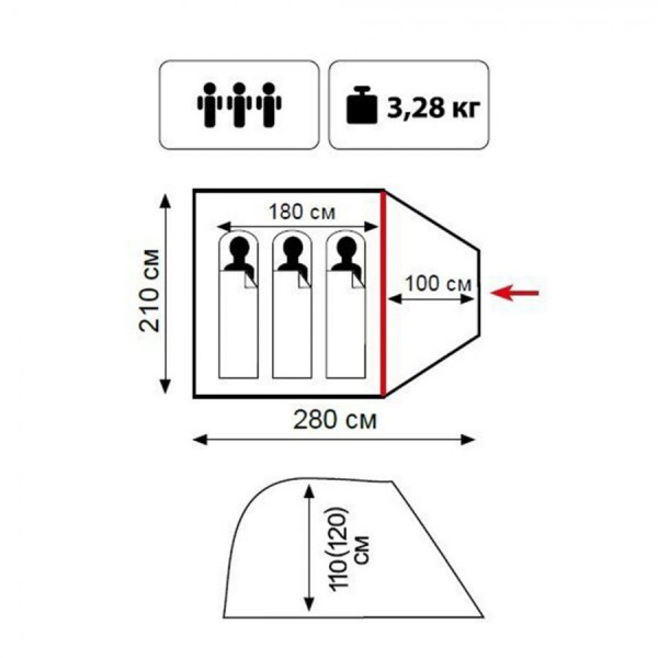 Палатка водостойкостью 4 000 мм. Пол спального отделения выполнен из армированного полиэтилена (терпаулинга) и устойчив к истиранию. Водостойкость терпаулинга очень высокая - 10 000 мм.