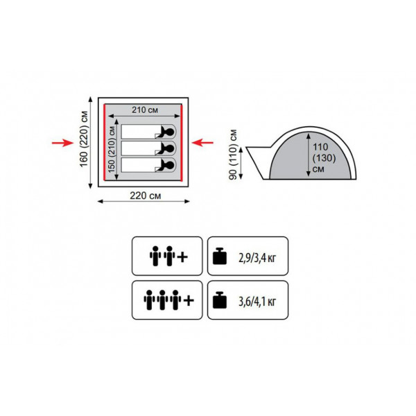 внешняя палатка 220(Д)x160(Ш)x110(В) см, внутренняя палатка 210(Д)x150(Ш)x105(В) см