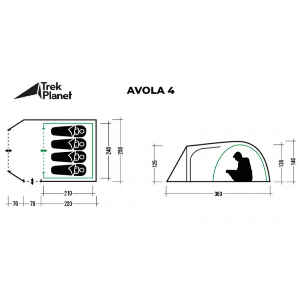 внешняя палатка 360(Д)x250(Ш)x140(В) см, внутренняя палатка 210(Д)x240(Ш)x135(В) см