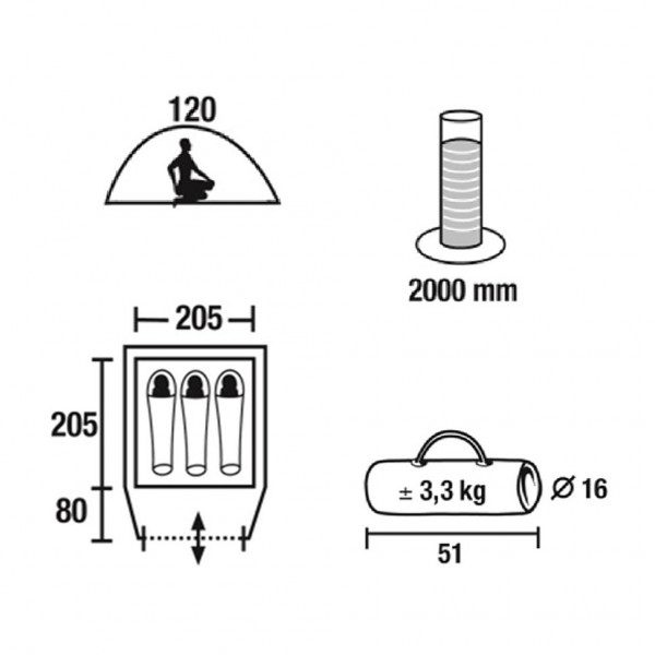 Водостойкость внешнего тента 2000 мм и проклееные швы гарантируют прекрасную защиту от дождя и ветра.
