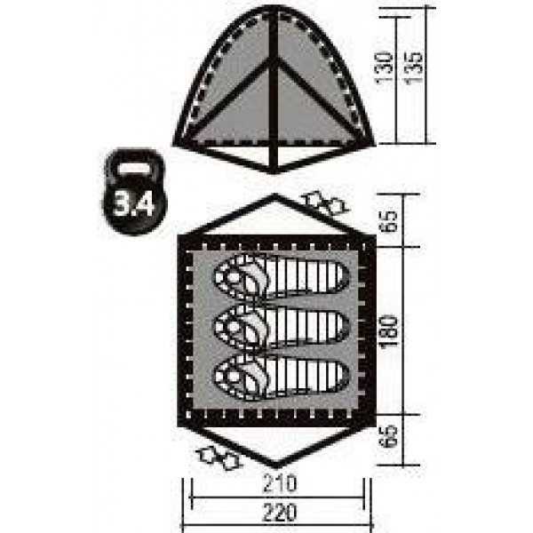Все размеры внешняя палатка 220(Д)x310(Ш)x135(В) см, внутренняя палатка 210(Д)x180(Ш)x130(В) см
