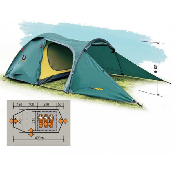 Универсальная палатка для туризма с увеличенным основным тамбуром и дополнительным тамбуром в задней части палатки. Это позволит оптимально разместить внутри палатки не только персональные вещи, но и крупногабаритное снаряжение -например убрать в палатку кемпинговую мебель во время дождя. Внутренняя палатка имеет два входа – это создает большую вариабельность расположения палатки в туристическом лагере и обеспечивает сквозную вентиляцию изделия. Для повышения комфорта – палатка имеет приточные клапаны, расположенные внизу палатки и вентилируемое окно в крыше. Все необходимые аксессуары, для установки и эксплуатации палатки, в комплекте.