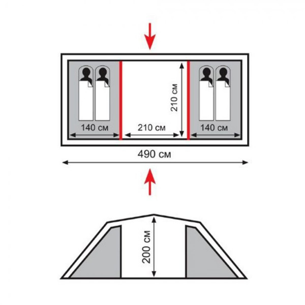 Все размеры внешняя палатка 500(Д)x220(Ш)x200(В) см, две внутренние палатки 210(Д)x140(Ш)x165(В) см