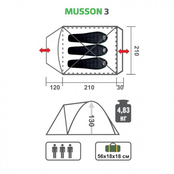 Палатка MUSSON 3 Helios - удобная 3-местная палатка с вместительным тамбуром, сформированным отдельной дугой.