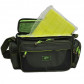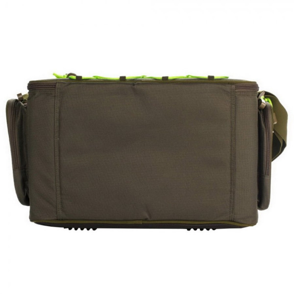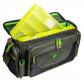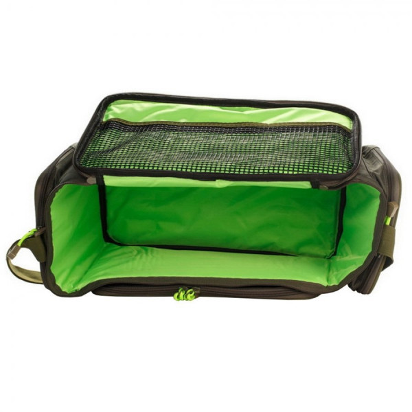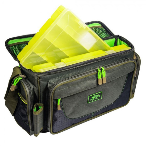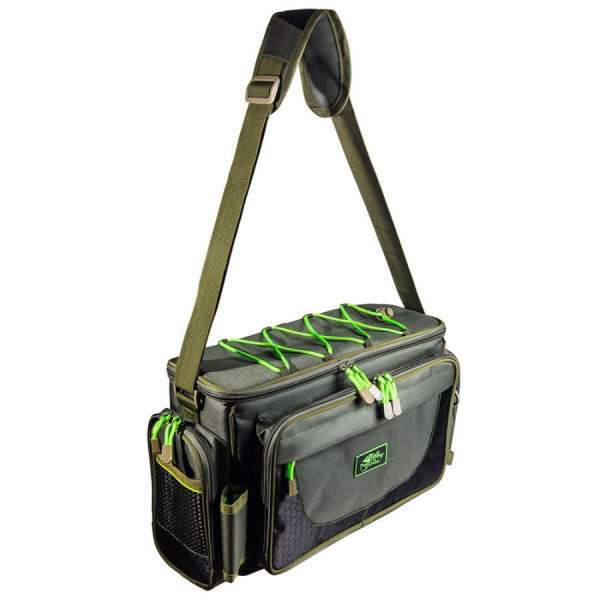 Удобная сумка через плечо для рыбака, объем 16 л. Имеет внутри 2 пластиковых контейнера для снастей с шестью отделениями в каждом. По бокам и петли для крепления мелких вещей. По периметру сумки 3 кармана на молнии. Большой спереди и два маленьких по бокам. Сверху сумки шнур, можно закрепить ветровку или головной убор. Ремешок регулируется по длине.