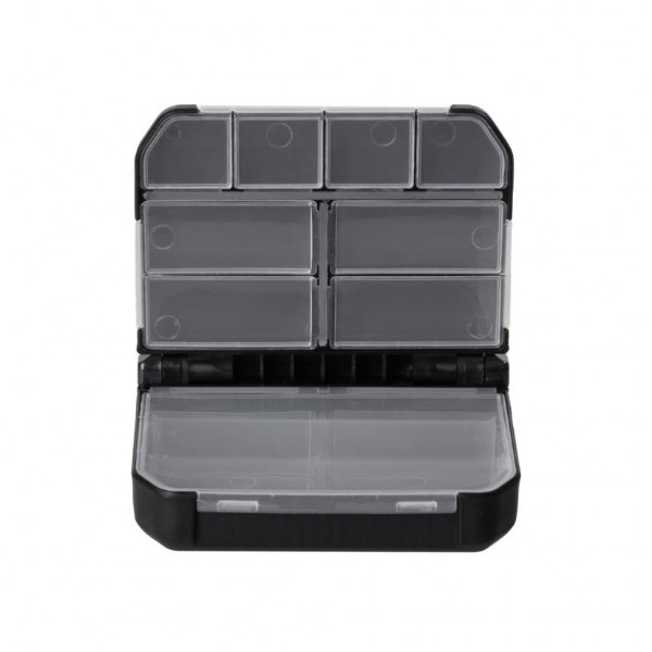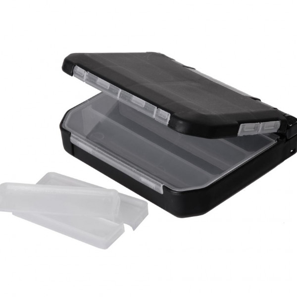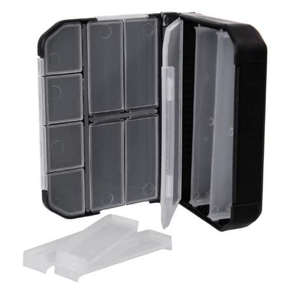 Коробка для рыболовных приманок, крючков и фурнитуры. Раскрывается книжкой. С одной стороны один отсек с передвижными перегородками, которые можно поставить в соответствии с вашими потребностями. С другой четыре маленьких отдельно открывающихся отсека под крючки, грузики или другую мелочь. И четыре отдела с разными крышками побольше.