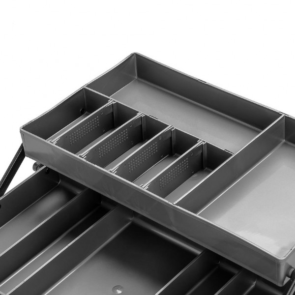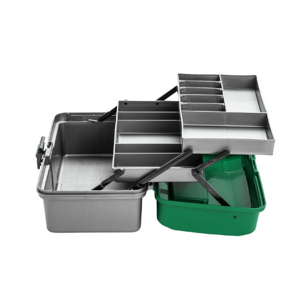 Прочный и надежный ящик для инструментов и разных бытовых мелочей позволит компактно их хранить и переносить. Две выдвижные полки с различными отсеками обеспечивают возможность хранения множества мелочей: болты, шайбы, шурупы, сверла и т.д. Материал ящика: ударопрочный и морозостойкий пластик. Преимущество пластика в том, что ящик имеет небольшой вес (1 кг). Морозоустойчивый пластик позволит защитить находящийся внутри инструмент от значительных перепадов температур.