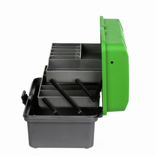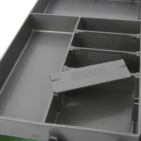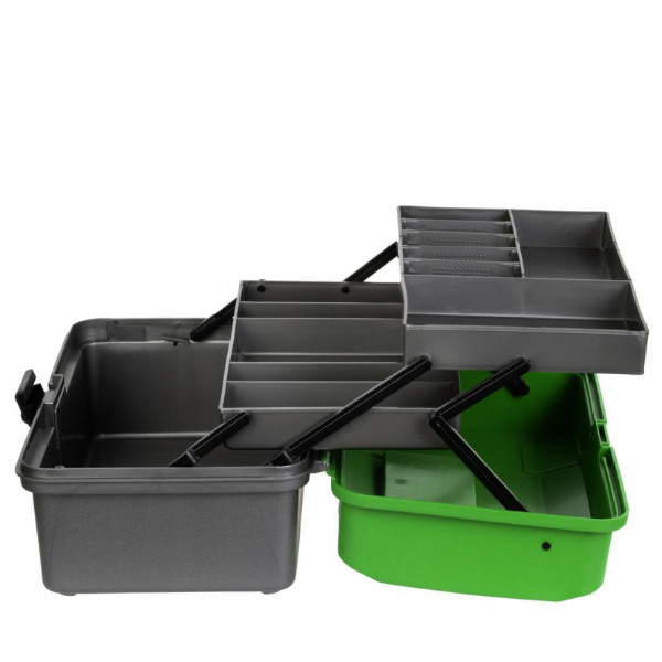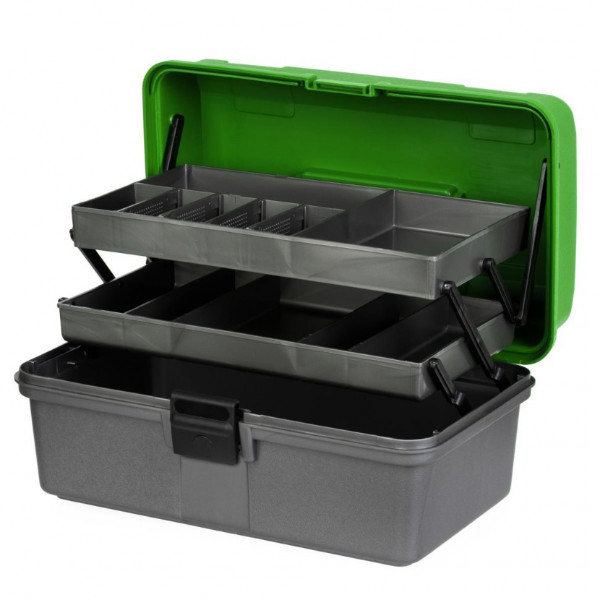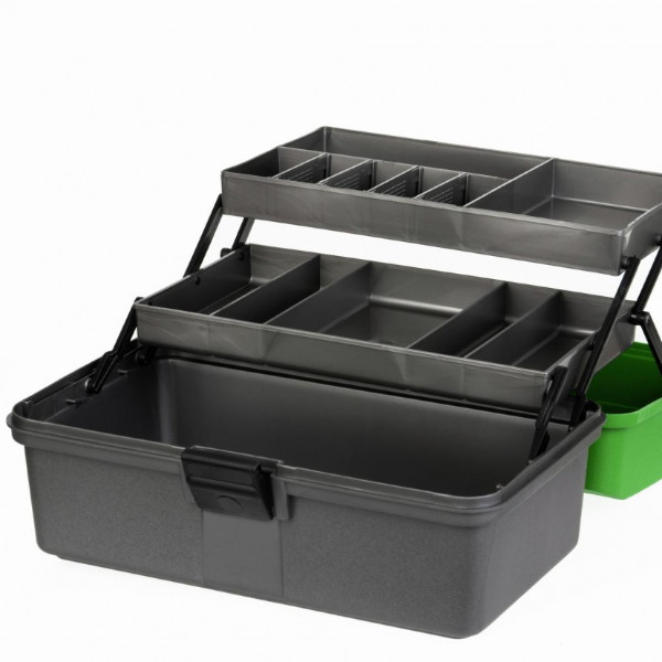 Удобный и вместительный ящик с двумя выдвижными полками для различной рыболовной оснастки: поплавков, приманок и другой полезной мелочи. На дно ящика можно положить 1-3 спиннинговых катушек.
