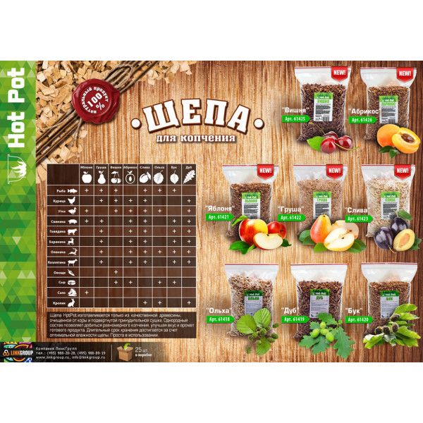 Щепа яблони "hot pot" изготавливается только из натуральной древесины. Проста в использовании. Однородный состав позволяет добиться равномерного копчения, улучшая вкус и аромат готового продукта. Длительный срок хранения достигается за счет оптимальной влажности щепы.