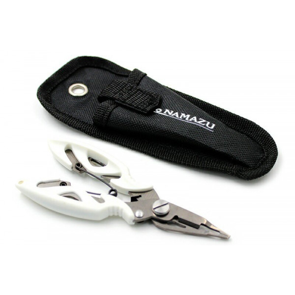 Многофункциональные рыболовные щипцы Namazu N-FTS07. Изготовлены из металла с дополнительным титанированием для защиты от коррозии. Удобные подпружиненные ручки из пластика с упором под пальцы и стопором. Сквозное отверстие для фиксации ретривера или карабина. Концевой зуб для разжатия заводных колец, короткие плоскогубцы (прямые губки), серейтор, кусачки. В комплекте тканевый чехол на липучке с люверсом и петлей под ремень.