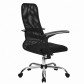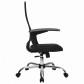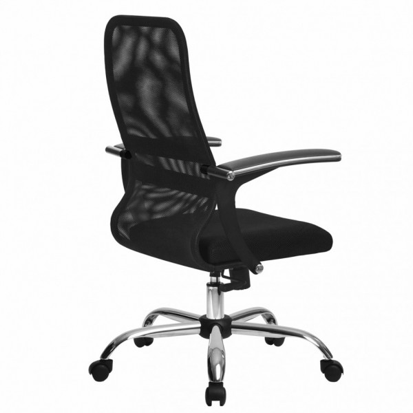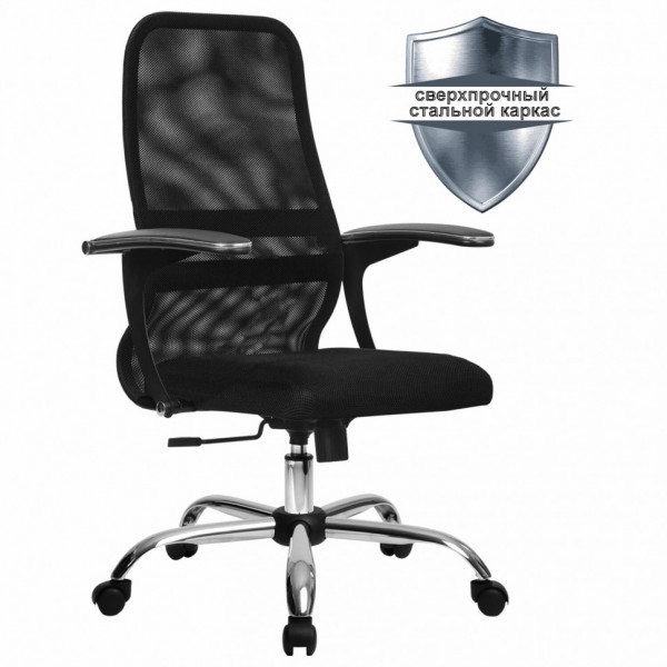 Спинка низкая, эргономичной формы с ярко выраженной поясничной поддержкой. Спинка имеет сверхпрочный стальной каркас с износостойким полимерным покрытием черного цвета. Сиденье средней жесткости, объемное на столярном каркасе. Обивка из износоустойчивой "дышащей" сетчатой ткани. Подлокотники современные "Бумеранг", стальные с полимерным покрытием черного цвета, c хромированным молдингом, с мягкими накладками из экокожи. Пятилучие - металлическое хромированное. Модель оснащена механизмом качания "Top-Gun" с регулировкой под вес и возможностью фиксации в рабочем положении.