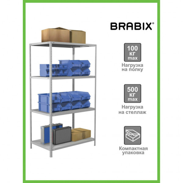 Стойка имеет разборную конструкцию, благодаря чему стеллаж поставляется в компактной упаковке. Максимальная нагрузка на полку при этом достигает 100 кг, на стеллаж - до 500 кг. Стойки с усиленным угловым профилем сложного сечения 30х30 мм и толщиной металла 1,2 мм. Полки имеют толщину основания 0,5 мм, усилены центральным ребром жесткости. Высота бокового и торцевого ребра полки - 33 мм, толщина - 1 мм.Для повышения жесткости всей конструкции верхняя и нижняя полка усилена дополнительными Г-образными уголками. Шаг установки полок - 25 мм.Опоры пластиковые, нерегулируемые. Вся необходимая фурнитура для сборки в комплекте.Продукция марки Brabix выделяется лучшим соотношением цены и качества.