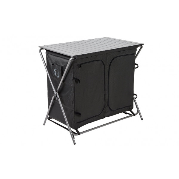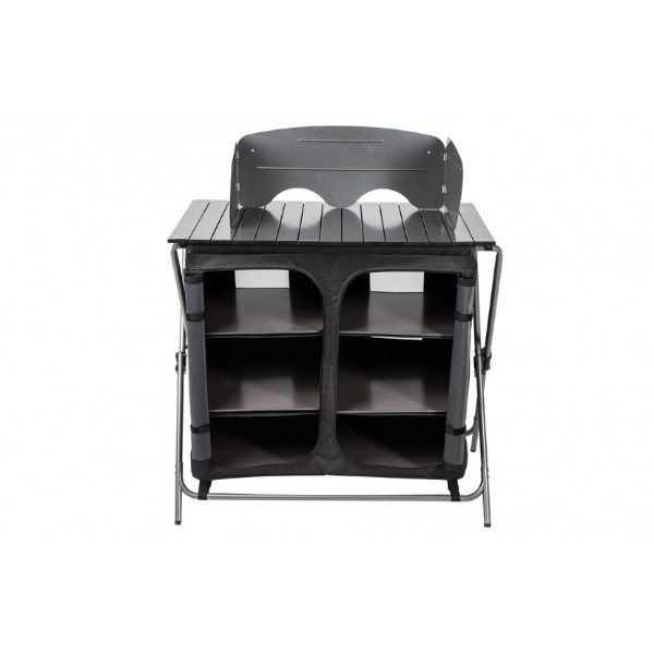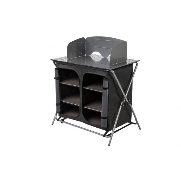 Кухня кемпинговая FHM Rest - правильное решение для кухни в кемпинге. Мы предусмотрели все: простота установки, надежный, устойчивый каркас, стенка, защищающая от ветра во время готовки, большой рабочий стол со специальным алюминиевым покрытием легко моется и с большим запасом прочности. Под рабочей поверхностью стола удобные полки для хранения продуктов и кухонной утвари.