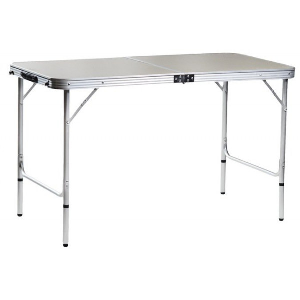 Стол сделан из алюминия, его вес не превышает 5 кг. Столешница складывается пополам, образуя удобный для транспортировки чемодан. В сложенном виде конструкция не занимает много места и имеет удобную ручку для переноски. Для предотвращения открытия стола, чемодан надежно закрывается на стальные крючки. Для усиления конструкции ножки имеют соединяющую перекладину. Она придает столу устойчивость и служит дополнительной опорой.