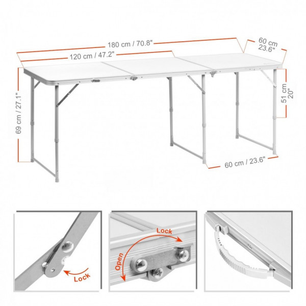 Туристический складной стол, состоящий из 3 секций и отличающийся внушительными размерами: 180х60х70 см. Его можно использовать для организации выездов всей семьей на природу, для организации банкетов под открытым воздухом, для комфортного отдыха большой компанией.