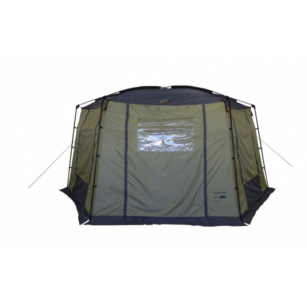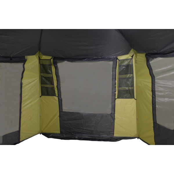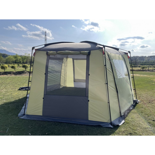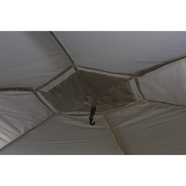 Просторный шестиугольный тент-шатер для кемпинга. Обширное внутреннее пространство позволит разместить большую компанию с мебелью. Несложная конструкция позволит быстро собрать тент вдвоем. Форма и ветровые оттяжки обеспечивают удовлетворительную ветроустойчивость. Москитные сетки на каждой стороне шатра. И каждую индивидуально можно закрыть. На обоих входах большие обзорные окна.