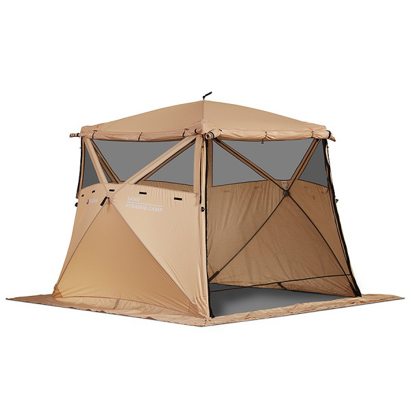 Трапециевидная кухня-шатер четырехгранной формы Higashi Pyramid Camp Sand, цвет песочный. Оснащена четырьмя съемными карманами, стойками для установки солнцезащитного козырька, дополнительными усилениями по углам и по центральному потолочному хабу. Внимание!!! В связи с тем, что при установке любая модель не имеет идеально правильную геометрическую форму, в техническом описании палатки показатели длины, ширины и высоты указаны согласно стандартизированных замеров компании-производителя и могут незначительно отличаться от фактических размеров.