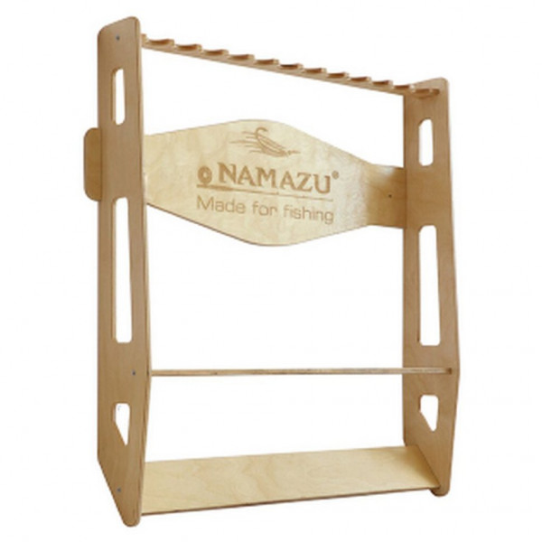 Брендированная стойка для удилищ на стену, изготовлена из фанеры, покрыта лаком. Вмещает 12 удилищ.