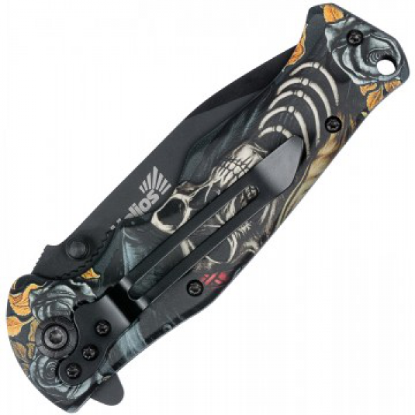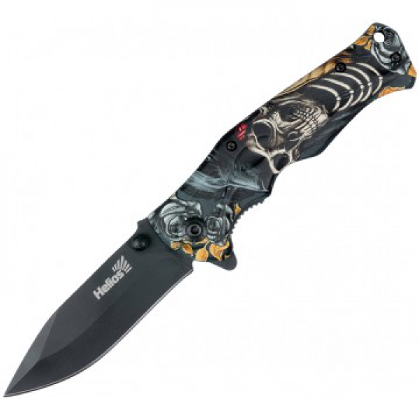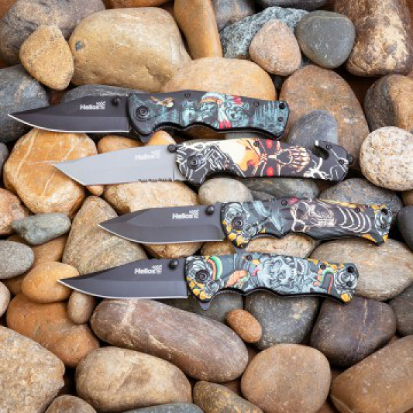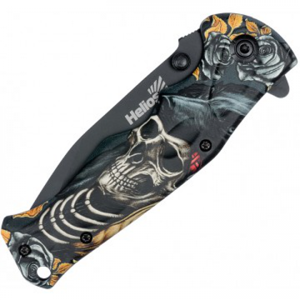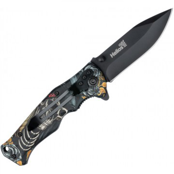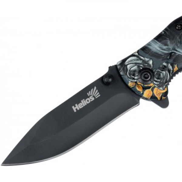 Серия складных ножей Helios, это удобные и прочные клинки. Ножи Helios предназначены для использования в повседневной жизни EDC (Every Day Carry), но при необходимости, ножи не подведут Вас и в непредсказуемых ситуациях. В серии использован различный дизайн окраса рукояти, от граффити до кмф, а также фактурные вставки из ударопрочного пластика. Клинок данной модели имеет плейновую заточку и оборудован шпеньком и флиппером для удобного однорукого открывания. Фиксируется клинок с помощью замка Liner Lock. В качестве материала рукояти используется комбинация из стальных накладок и ударопрочного пластика G10. Ножи Helios - это надежные и прочные клинки, соответствующие ГОСТ Р 51501-99.