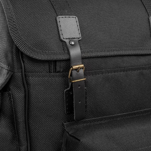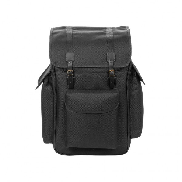 Ранец объемом 45 л. Застегивается сверху на две короткие молнии и закрывается клапаном на кожаных ремешках. Легкая прочная формоустойчивая конструкция ранца обеспечивается изолоновыми вставками и позволяет с легкостью переносить значительные грузы. На передней стенке и по бокам ранца имеются объемные карманы. Лямки широкие, плотные, умеренно мягкие, регулируются при помощи кожаных ремней.