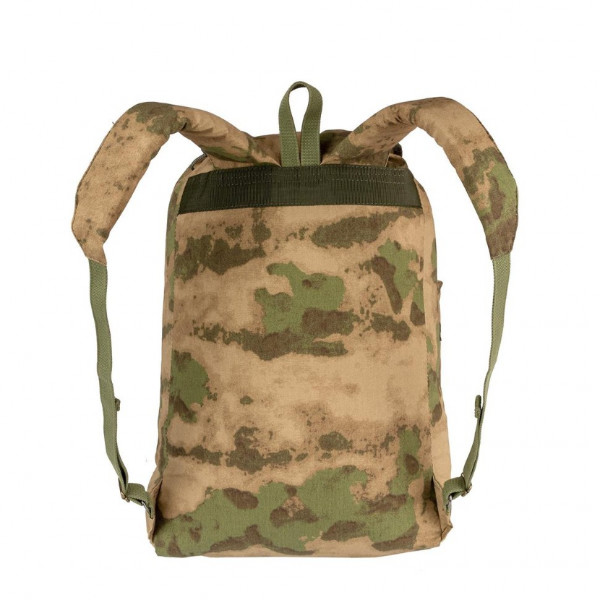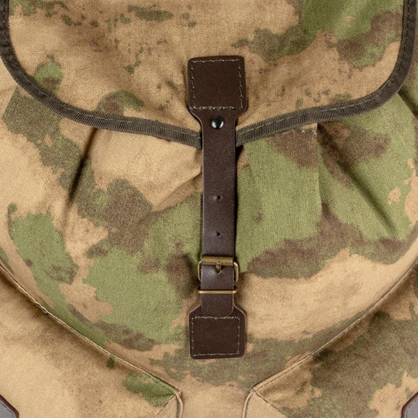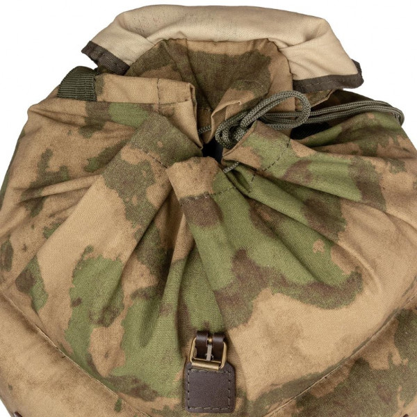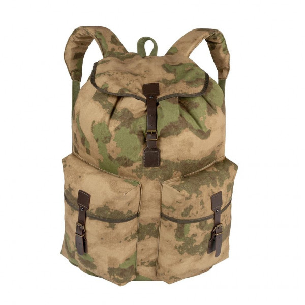 Рюкзак средний объемом 40 л. Имеет снаружи два больших объемных кармана. Карманы и клапан рюкзака застегиваются на кожаные ремешки. Верх утягивается шнуром, продетым сквозь люверсы. Лямки рюкзака широкие, плотные, в меру мягкие, регулируются при помощи кожаных ремней.