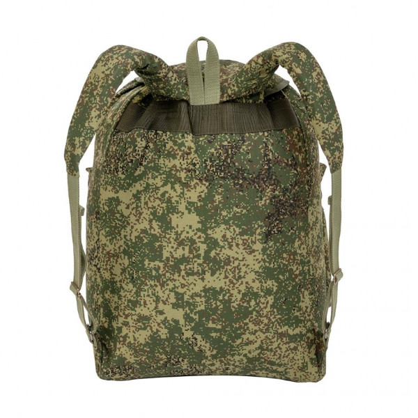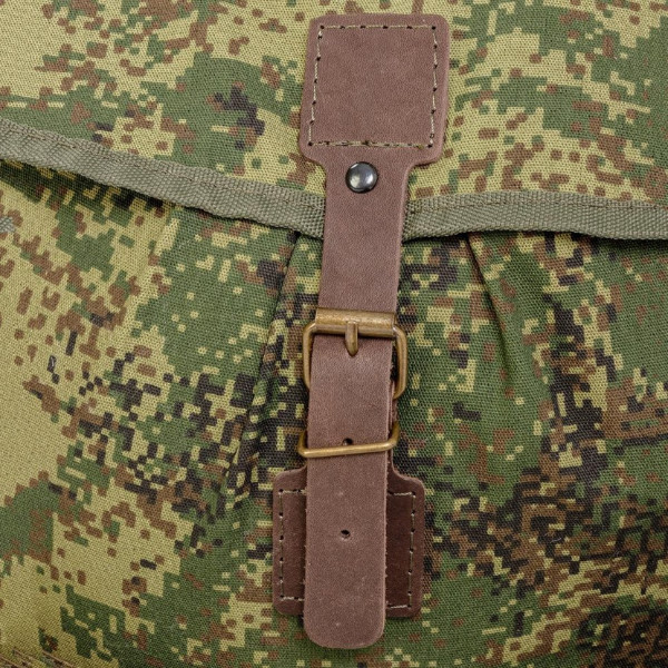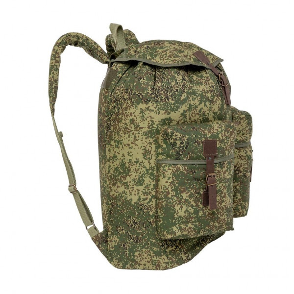 Рюкзак средний объемом 40 л. Имеет снаружи два больших объемных кармана. Карманы и клапан рюкзака застегиваются на кожаные ремешки. Верх утягивается шнуром, продетым сквозь люверсы. Лямки рюкзака широкие, плотные, в меру мягкие, регулируются при помощи кожаных ремней.