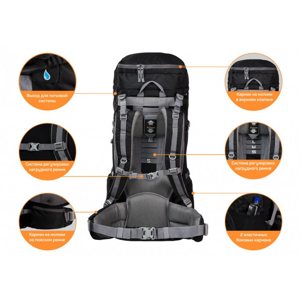 Особенности анатомическая спина с каркасом из алюминиевых пластин, регулировка размера спины рюкзака (S-XL), нагрудный ремень, эластичная стяжка на фронтальной панели, 2 боковых эластичных кармана, 2 кармана в вехнем клапане, дополнительный вход в основное отделение,