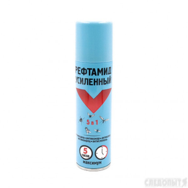 Рефтамид УСИЛЕННЫЙ Максимум — репеллентное средство для эффективной борьбы с кровососущими насекомыми. В его состав входят увеличенные количества действующих веществ, обеспечивающие более длительную - до 5 часов - и надёжную защиту от комаров, мокрецов, москитов, мошек, слепней, блох, а также от таёжных и лесных клещей.