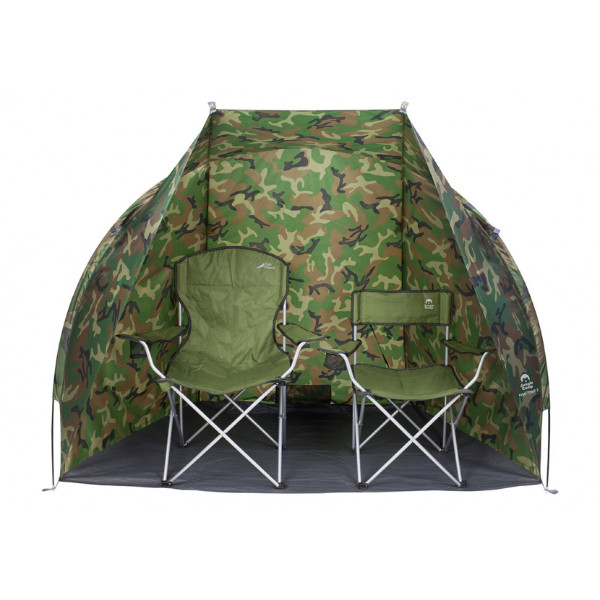 Камуфляжный тент Jungle Camp "Fish Tent 2", обеспечивает защиту от солнца и ветра и небольших осадков - идеально подойдет для любителей рыбалки или охоты. Внутри легко помещаются два кемпинговых стула. Очень прост в установке, имеет малый вес и удобный чехол с ручкой для переноски.