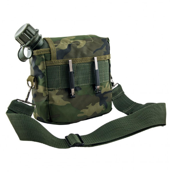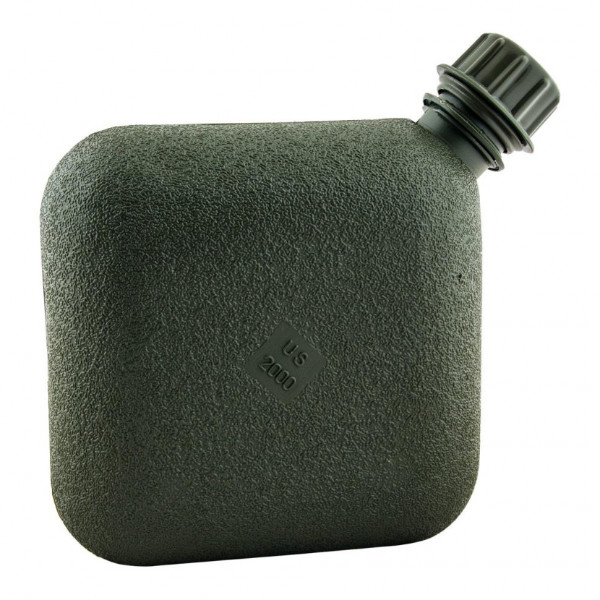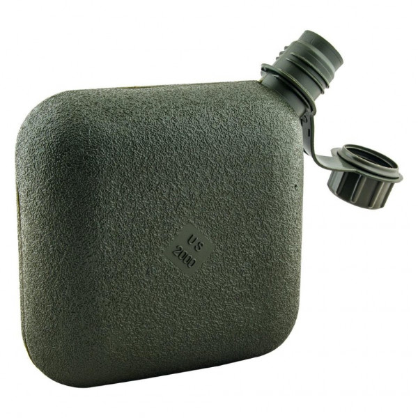 Фляжка для хранения и транспортировки жидкости, выполненная в военном стиле. При небольшом весе (315 г) и компактных габаритах фляжка вмещает 1,9 л жидкости. Форма – прямоугольная, с боковым горлышком. Поверхность фляжки, во избежание скольжения в руке, – шероховатая. Крышка имеет страховочное крепление к бутылке и ребристую поверхность для удобства открывания. Широкое горлышко гарантирует легкое наливание напитков. Крышка герметично закрывается, благодаря чему напитки не портятся и не приобретают специфических запахов. Фляжка изготовлена из прочного пищевого пластика, который не деформируется при механическом воздействии. В комплекте – удобный чехол из полиэстера с регулируемым ремнем для носки на плече. Он крепится на металлических карабинах и легко снимается при необходимости. Сам чехол застегивается на фастекс, что очень удобно, так как можно достать флягу в считанные секунды. Спереди имеется небольшой карман, предназначенный для хранения таблеток, обеззараживающих воду.