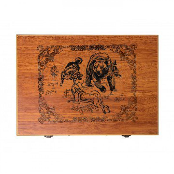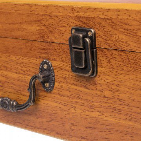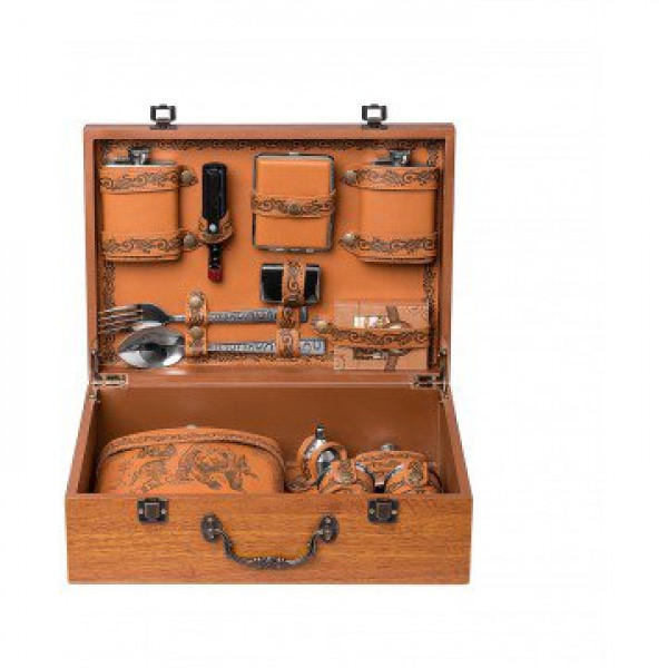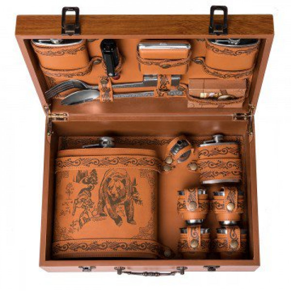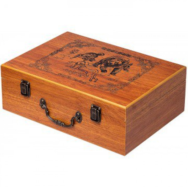 Подарочный набор в деревянном чемодане. Поверхность чемодана покрыта лаком, нанесен рисунок и узор. Чемодан закрывается на защелки, имеет удобную ручку.