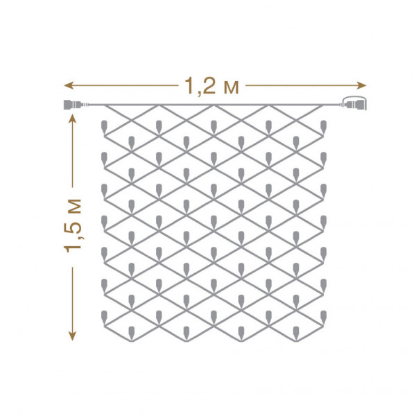 Размер гирлянды 1,2х1,5 м, количество светодиодов 144. Цвет свечения желтый, режим свечения статика, цвет провода прозрачный. Степень защиты IP 44. Мощность 2,88 W. Температурный диапазон использования от -30 до +50 °С. Есть возможность последовательного соединения до 1 500 LED. Трансформатор в комплект не входит! Приобретается отдельно. Срок службы 25 000 часов.