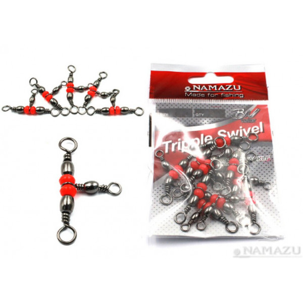 Модель тройного вертлюга Tripple swivel пригодится для того, чтобы соединить основную леску и вспомогательные поводки, предотвратив при этом их перекручивание. Такая модель найдет применение в любых способах ловли. У вертлюгов этой модели классическое цилиндрическое тело. Узлы, соединяющие части вертлюга, защищены бусинами красного цвета. Triple swivel продается в упаковках по 10 штук. Для большей долговечности вертлюг защищен антикоррозийным покрытием. Максимальный размер (3*5) способен выдержать нагрузку до 32 кг, минимальный размер (14*16) выдерживает до 8 кг. Обширный модельный ряд позволит подобрать вертлюг, способный выдержать нужный вес.